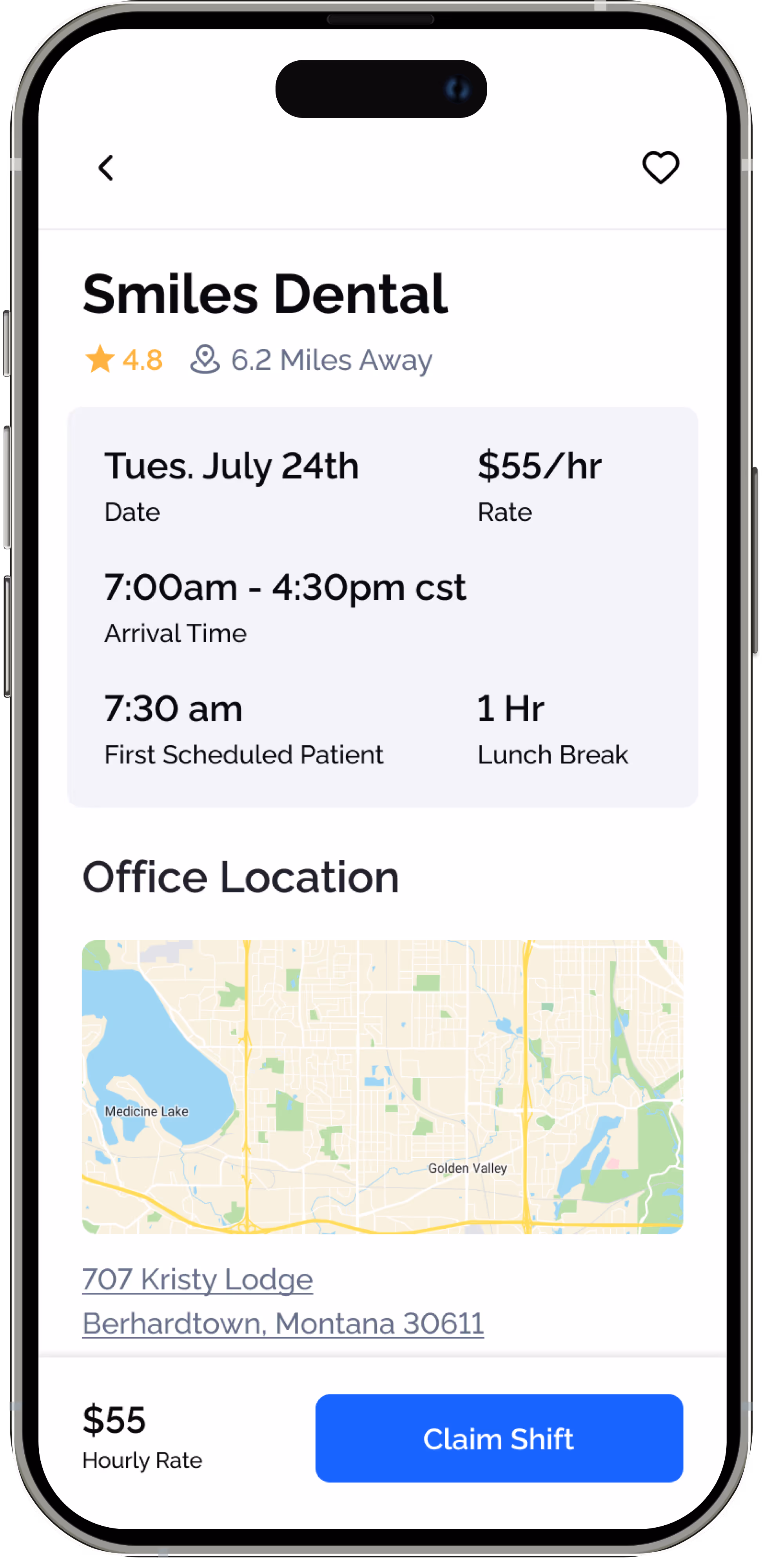 Just log in, post your shift, and we’ll match you with a qualified professional in your area. Once the shift is claimed, they’ll be scheduled automatically, and you’ll receive a text or email notification. You can then review their full profile, including a bio, skills, experience, and reviews from other offices. Only pay when your shift is worked!